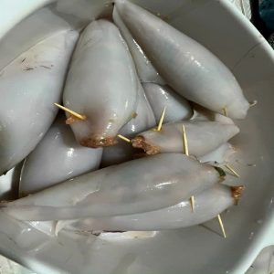 - Sau 20 phút ướp phần nhân chúng ta tiến hành cho nhân vào thân mực. Lúc cho nhân vào các bạn nên dùng tay nén để phần nhân có thể xuống cuối của con mực. Nhưng không phải vì thế mà cho nhân quá chặt hay quá lỏng vì nếu quá chặt sẽ khiến thân mực bị rách còn nếu quá lỏng thì phần nhân bên trong sẽ bị rời rạc khi chiên mực. Cuối cùng chúng ta dùng tăm ghim đầu mực lại để cố định phần nhân bên trong thân mực.