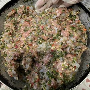- Chúng ta làm phần nhân bằng cách cho thịt lợn, nấm hương, mộc nhĩ, hành tây, miến, hành lá và râu mực đã chuẩn bị bên trên trộn đều lại với nhau. Sau khi đã trộn đều chúng ta cho vào hỗn hợp chút tiêu, muối và bột ngọt trộn đều lên cho nhân thấm đều gia vị tầm 20 phút.